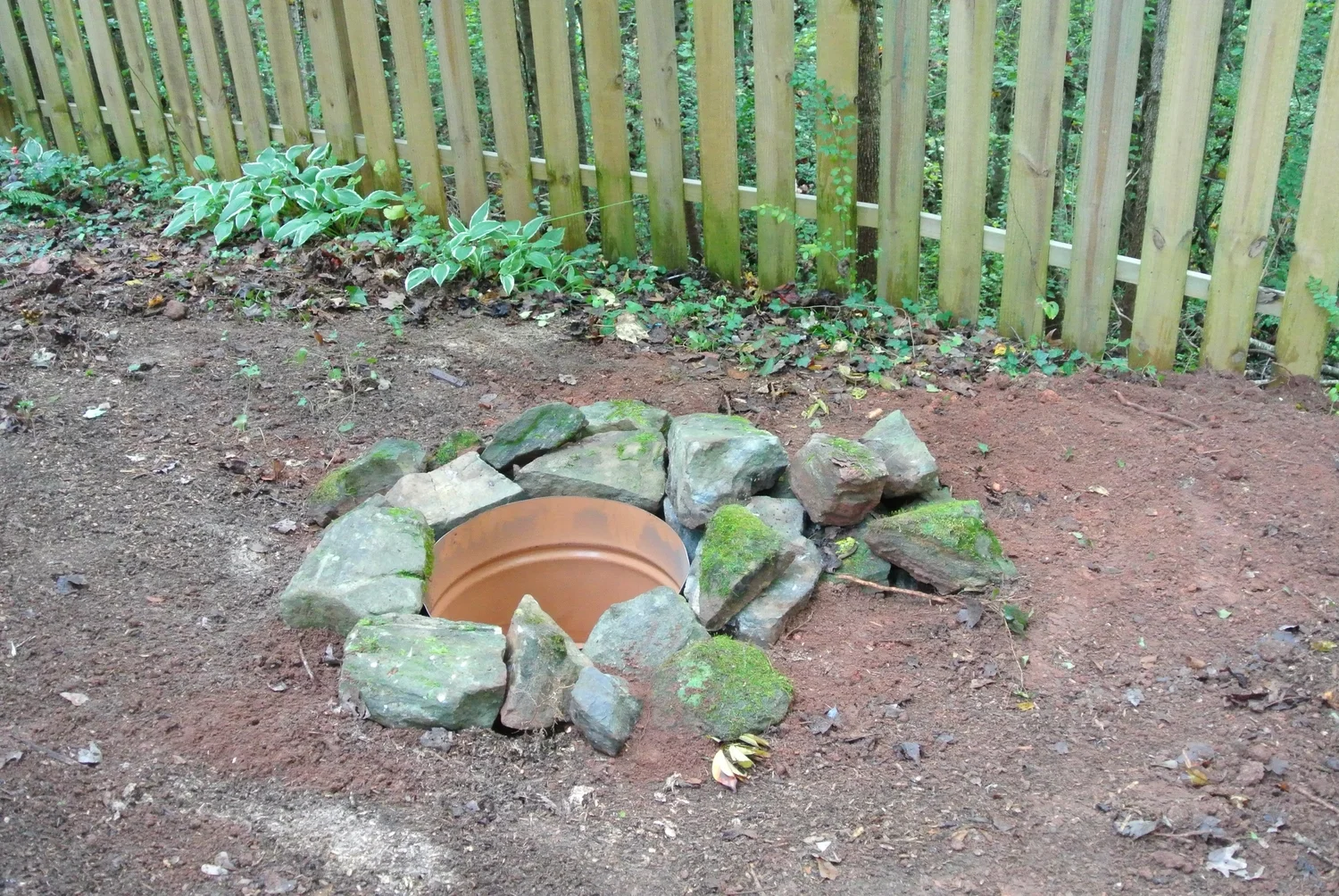 With these items in hand, we made our way home. Thomas dug a hole, and made sure to get airflow to the bottom of the barrel (where there is a hole with a grate over it). Next, we gathered up some paving/landscaping stones that were around little patches of landscaping in the backyard. We're going to re-do the landscaping in the backyard anyway, so it was a good way to repurpose the stones for right now.